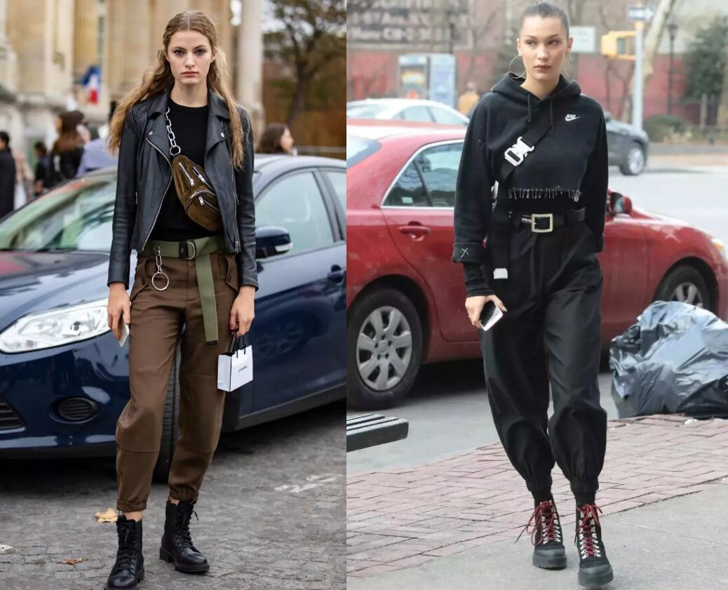 2、显瘦必备:马丁靴+束脚工装裤