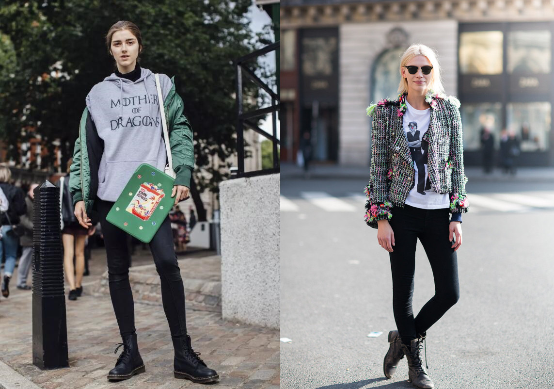 用黑色铅笔裤搭配黑色马丁靴,就能激发出1+1>2的效果。