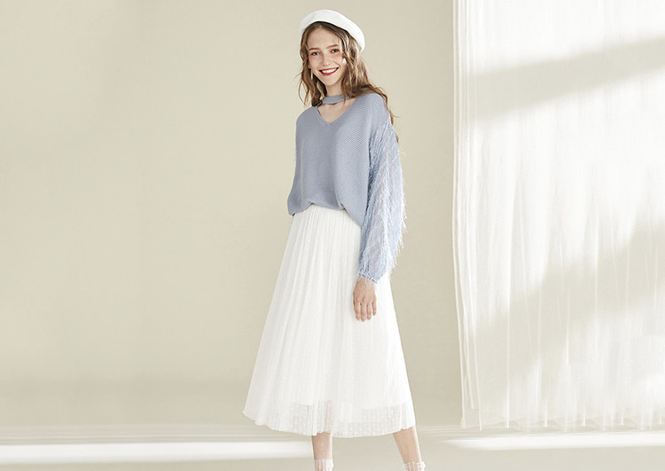 带着点点灰的蓝色针织衫,衣袖采用的是比较轻薄的材质拼接,并且袖身还带着点点细碎的小流苏,很有灵动甜美的感觉。