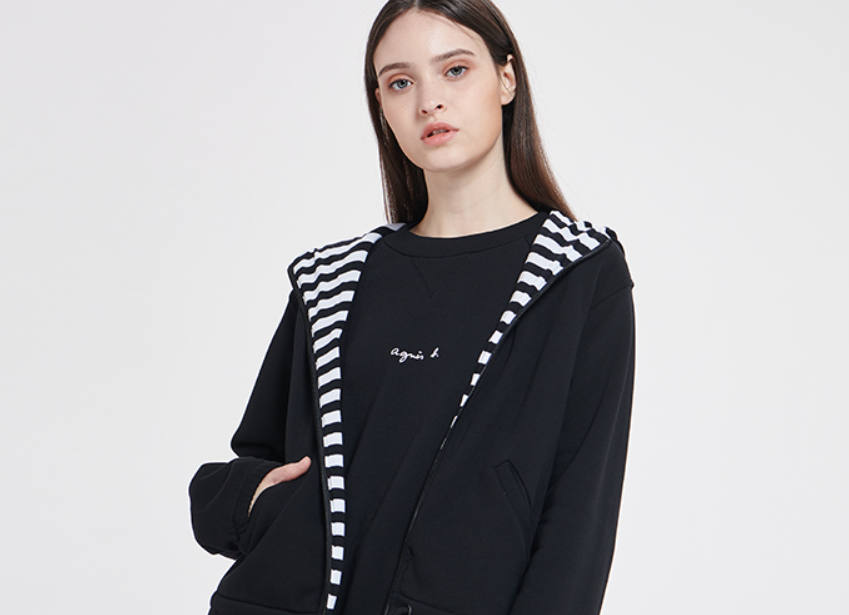 选好领型看面料,它可是影响我们卫衣穿着舒适度的关键哦!贴身穿的卫衣尽量选择全棉的面料,柔软且亲肤性强,不会对肌肤产生刺激性,同时垂坠性也会相对较好!agnès b.这款卫衣就是百分百棉的面料,穿着非常舒适亲肤,而且宽松适中的剪裁,也增强了棉料卫衣的透气性,在修饰身型上也有着更加出色的表现!