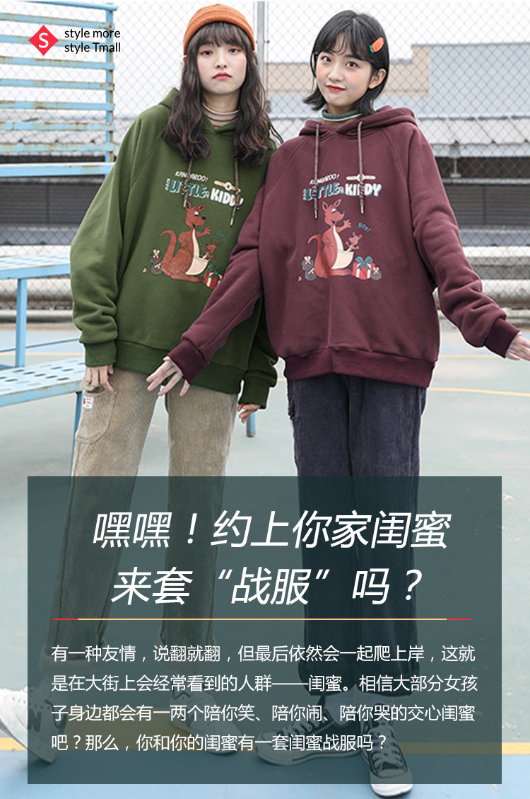 往往最经典的闺蜜装才好看。休闲一点的风格也算是现在比较流行的,所以,在选择上,我挑了两款不容易过时的,卫衣跟衬衫。这款卫衣中的印花选用的是海绵宝宝动画人物,我们都知道海绵宝宝和派大星,它们两个就是特别要好的朋友。无论是衬衫还是卫衣,搭配牛仔裤准没错!