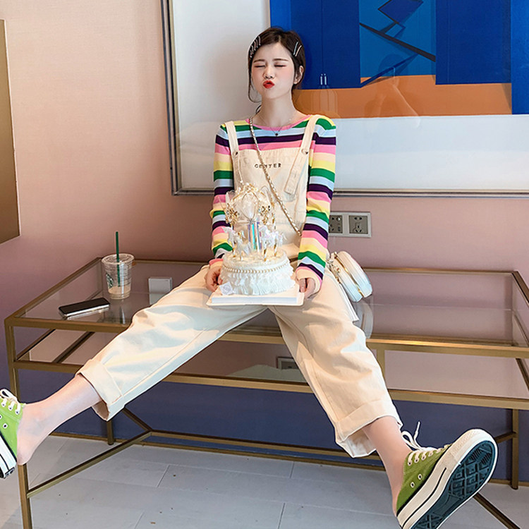 彩色条纹上衣+背带牛仔裤