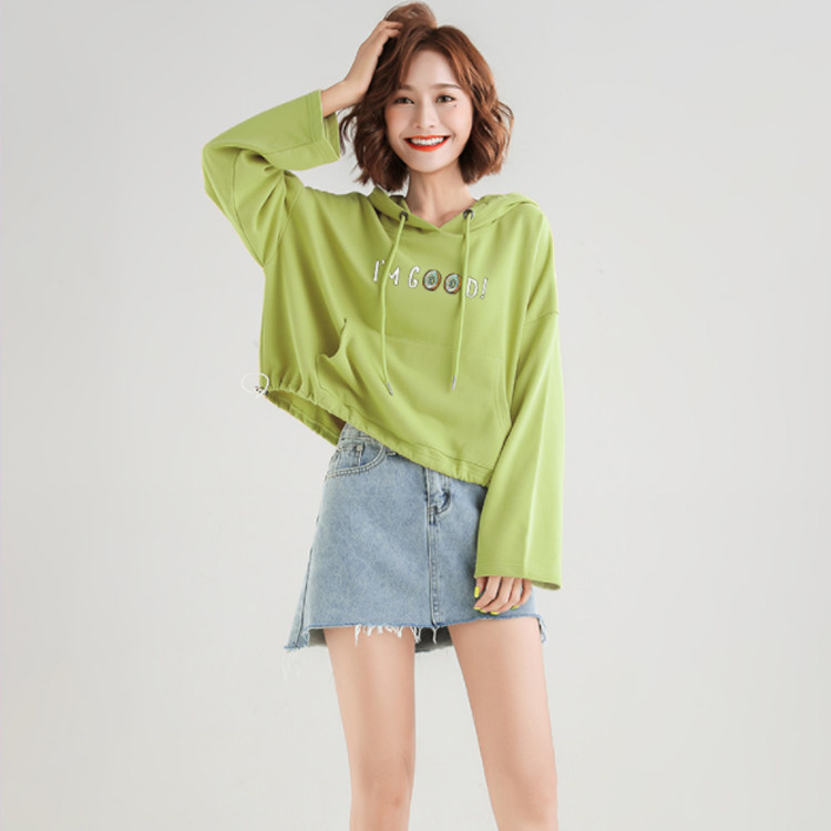 牛油果色的连帽卫衣,简直不要太清新了好啵,下半身配上高腰牛仔半身裙,模糊腰部线条,并秀出你的大长腿,配上一双小白鞋,高挑时髦两不误哦~