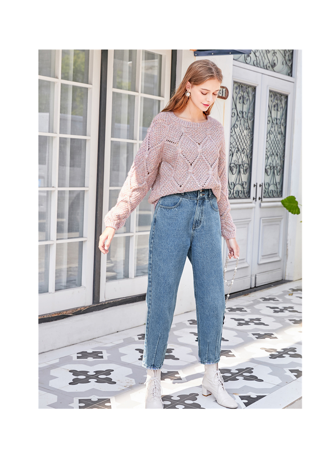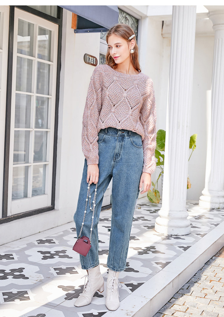 套头针织衫可以选择半塞衣角的穿法,搭配高腰阔腿裤就能穿出休闲感,里面还可以搭配上小高领的内搭,毫无违和感。