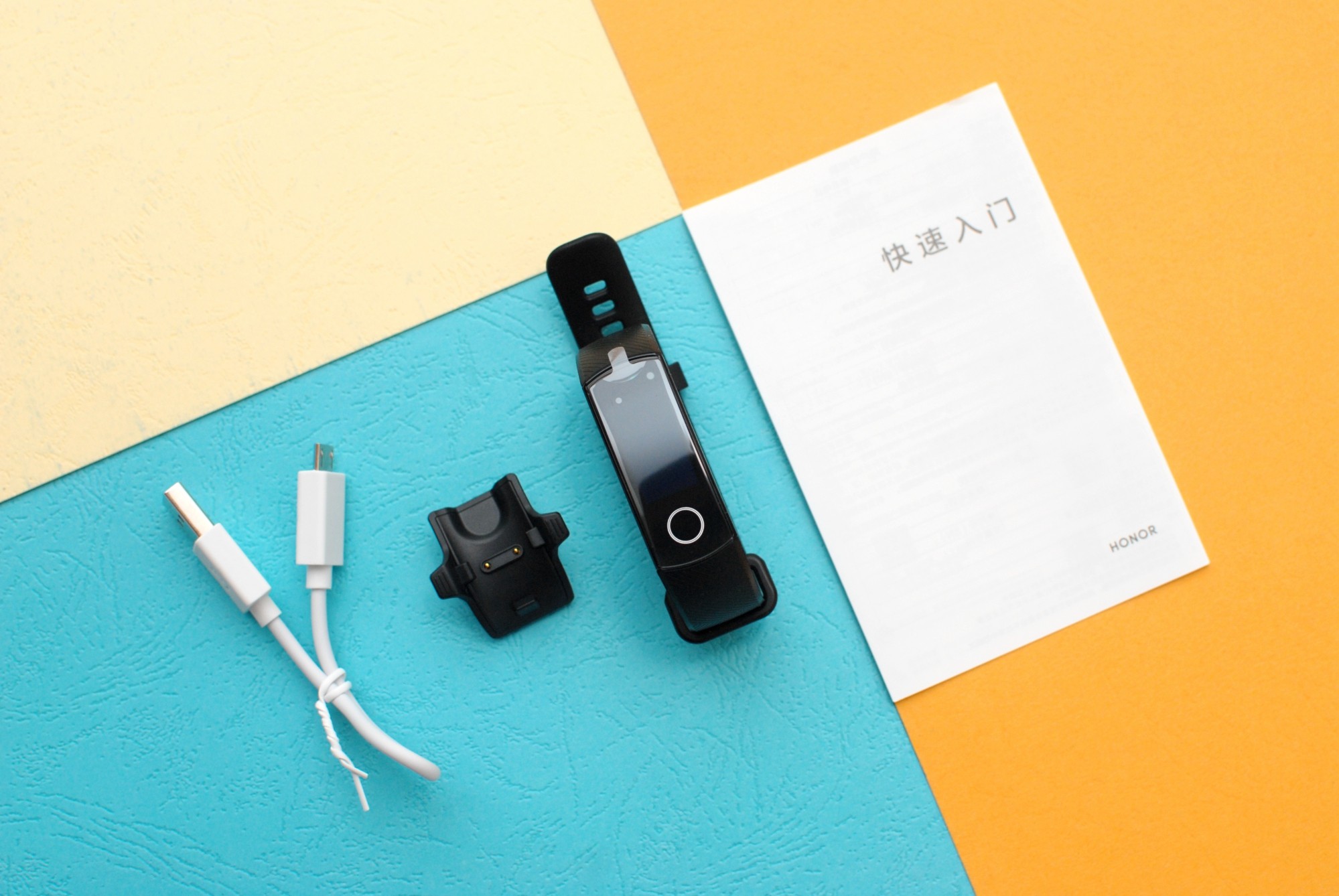 荣耀手环5的配置,除了手环主体之外,还有充电底座以及Micro usb充电线、产品使用说明书。