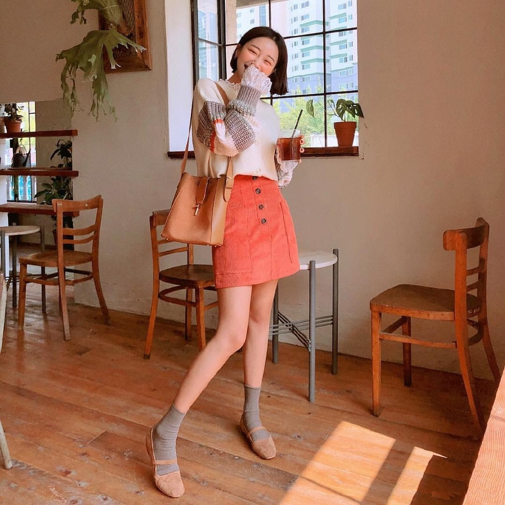 第二种短毛衣+A字半裙是秋季街头见过最多的韩范穿搭了~虽然秋风萧瑟,但是怎能抵挡得住爱美的小姐姐们展示自己的大长腿呢?