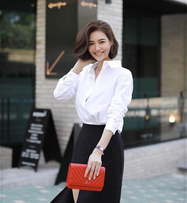 衬衣搭配半身裙,干练的衬衣遇上温柔的半身裙,白衬衣配浅色半身裙,简单利落。小编教你一招穿衬衣的小技巧,把最上面的两颗扣子解开,露出锁骨,彰显出女性的温柔,这就是秒杀同事的细节美。