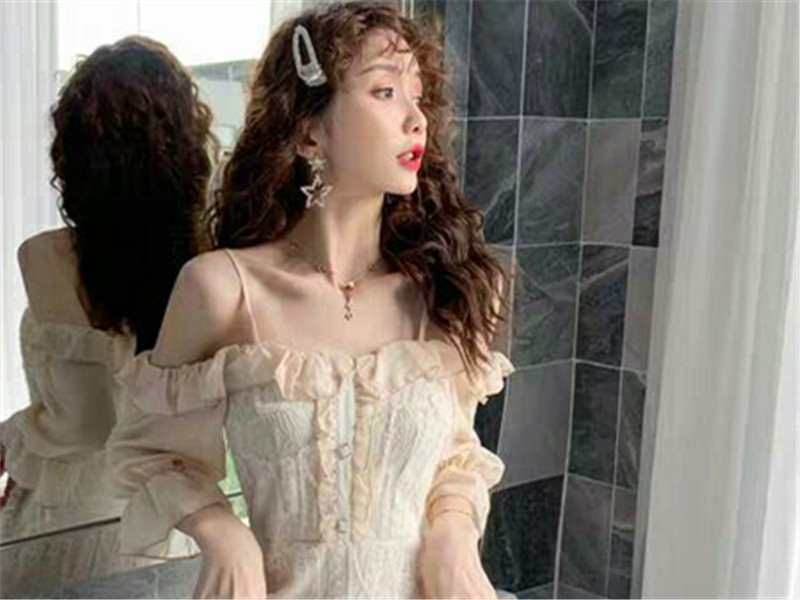 这款一字领的蕾丝裙,是法式复古的风格,荷叶边的设计,非常的凸显整个人的气质。 时尚的下摆美观大方,能够凸显出纤细的小腿。这是一款带有仙气的裙子,无论是逛街还是旅行都非常的百搭哦。
