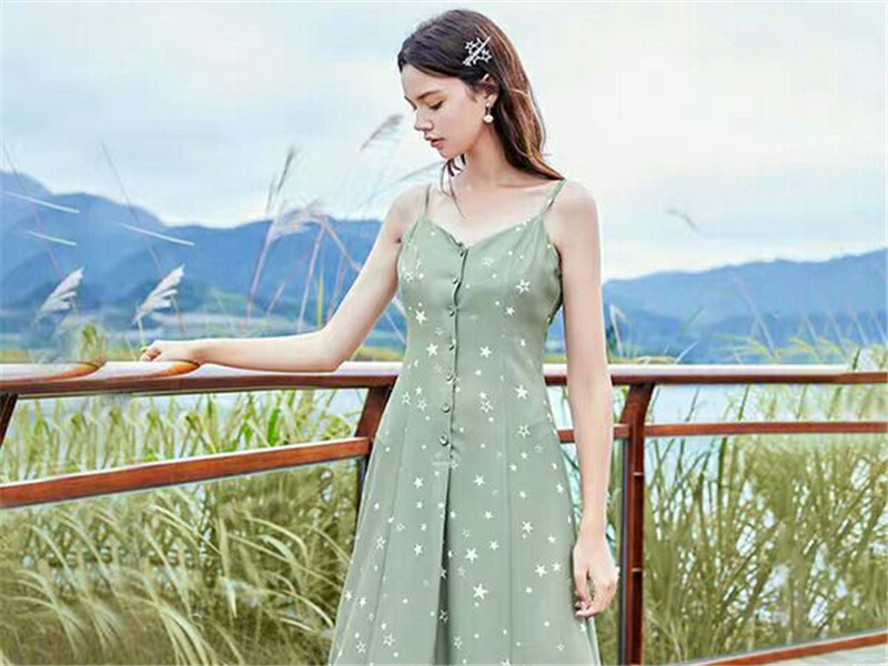 长款吊带雪纺裙,清新的配色加上星星印花的点缀,把整条裙子衬托得非常的简约大气,v领的设计会显得有一点点的小性感。版型很修身,结合两条纤细的吊带,身材比例衬托得特别棒。