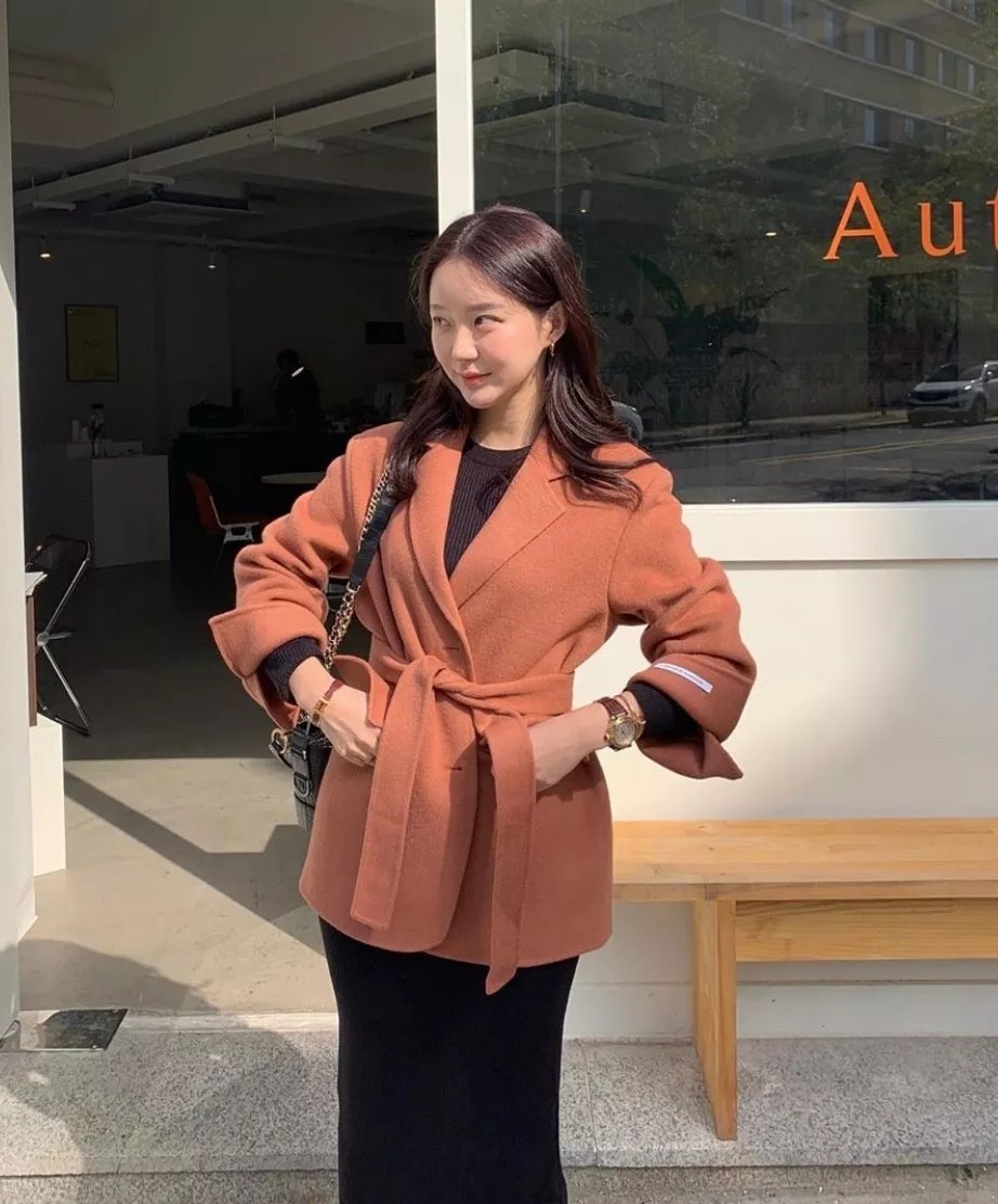 临近各种节日,也需要一些亮丽的颜色烘托气氛,南瓜色的短大衣很有冬日落叶感,里面是针织长裙,让你在人群中也不失存在感。 大衣搭配中跟短靴,也不要忘了用腰带强调上下身比例哦~