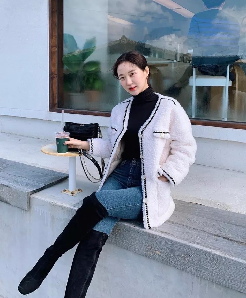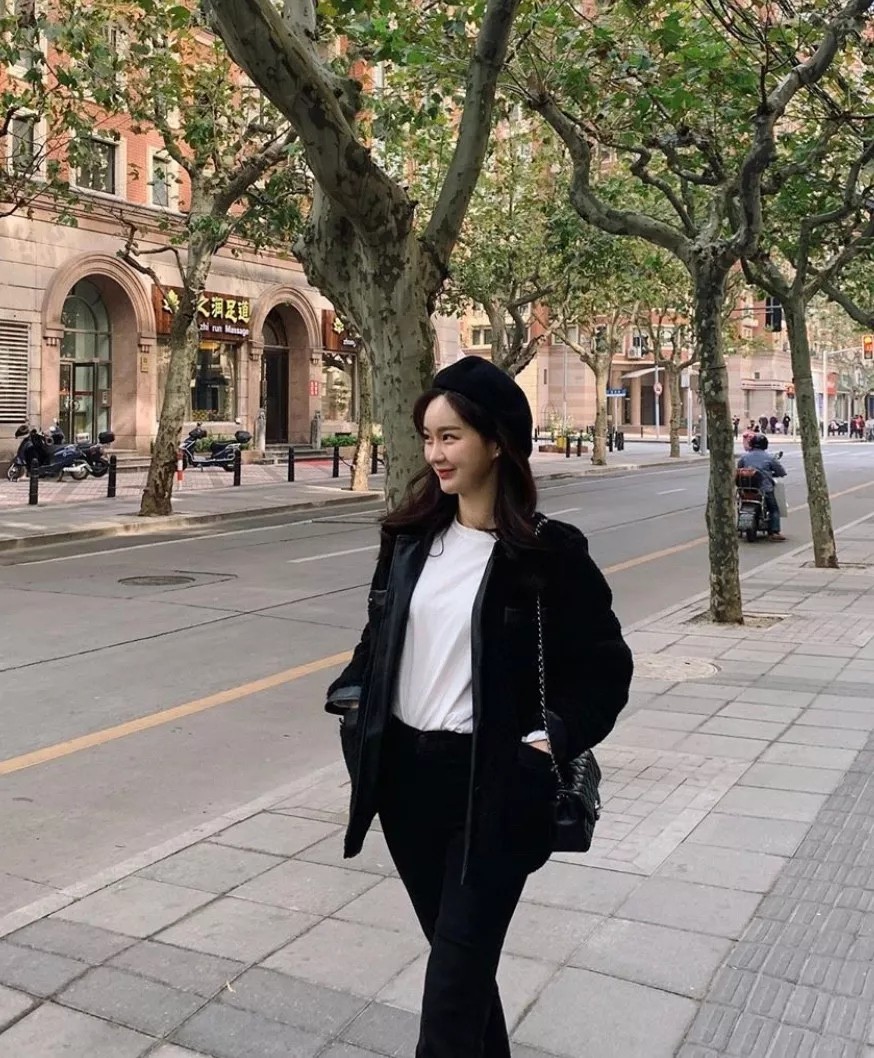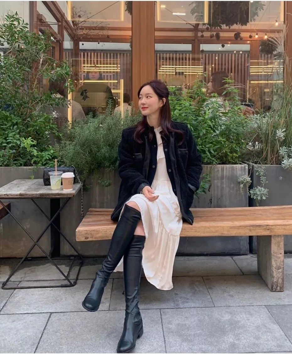 这样的 穿搭会比较偏轻熟风,显得整个人瘦瘦高高的比例很好,用黑色羊羔毛外套搭配上纯白连衣裙,简约大气。
