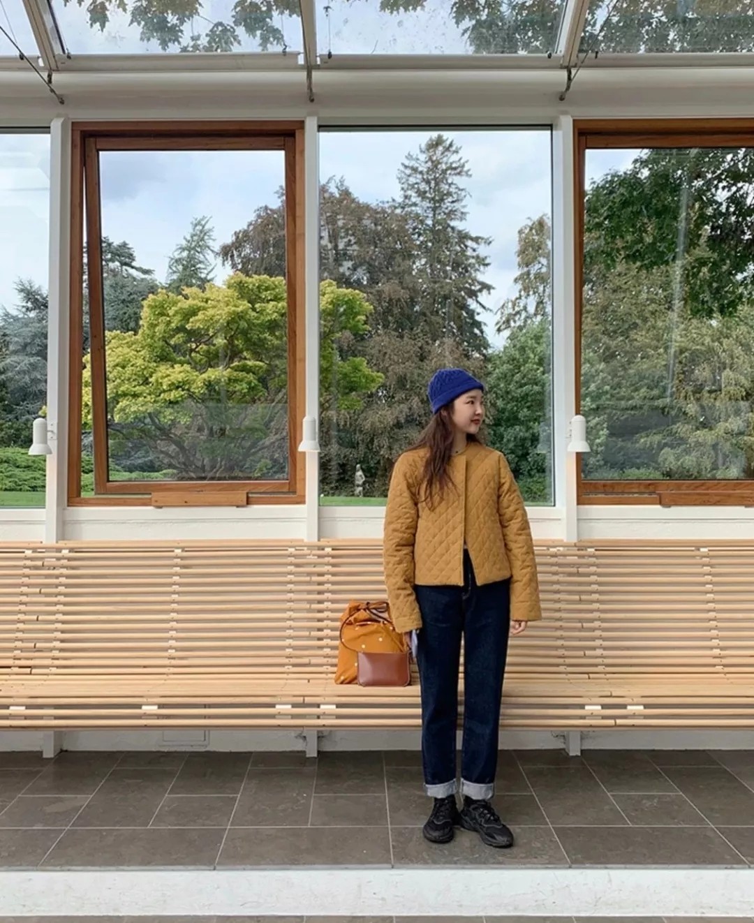 有时候也可以选择这样的风格跳脱,姜黄色的绗缝棉服短小活泼,再来一顶宝蓝色冷帽点缀,又是鬼马青春的感觉。 天气冷的时候,可以像这一样直接安排羽绒服,下身搭配牛仔,低调却又不失自己的穿衣sense。
