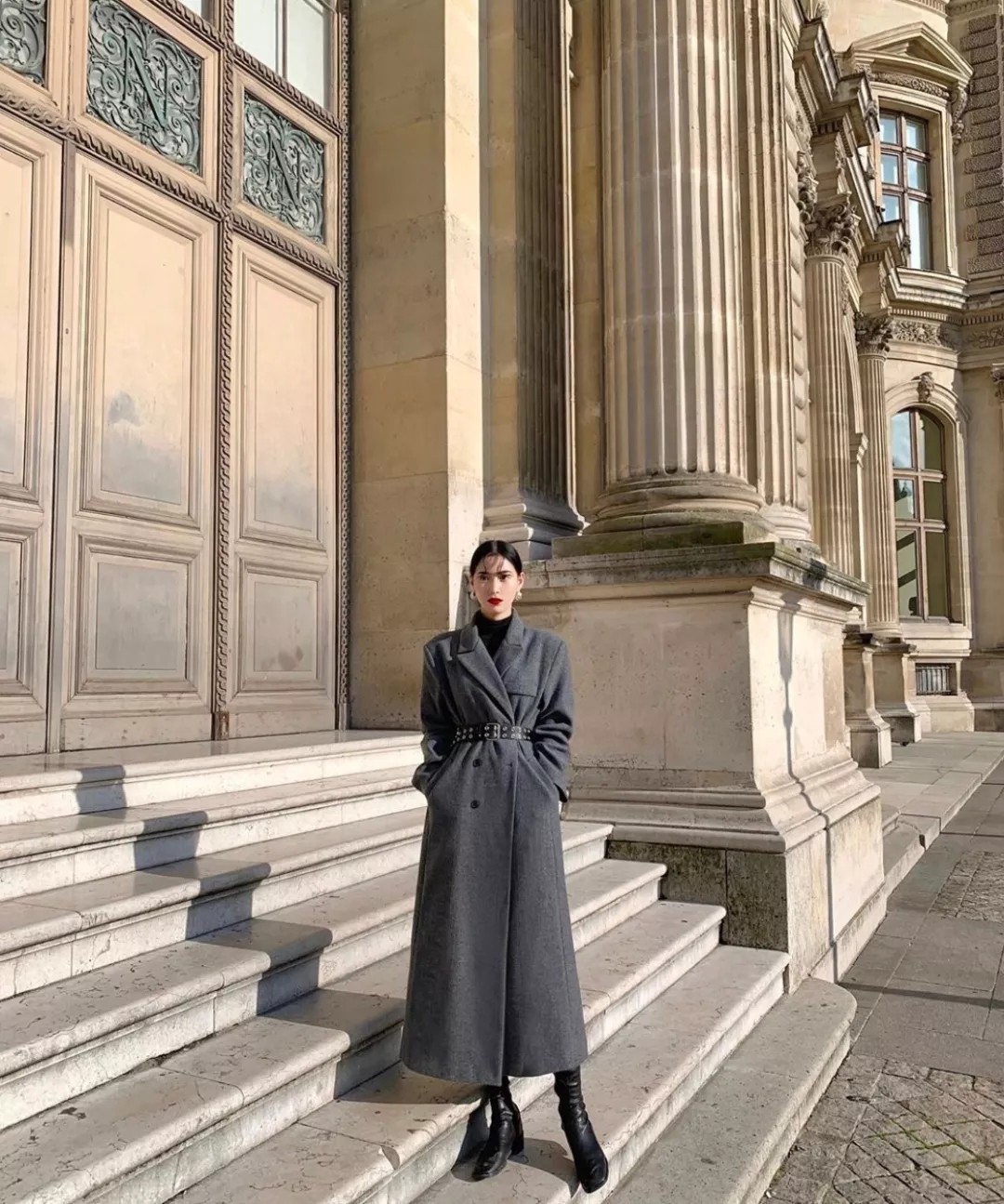 如果自身有着优越的比例,所以一些长款大衣驾驭的很好,灰色系大衣+黑色打底,高级感爆棚。