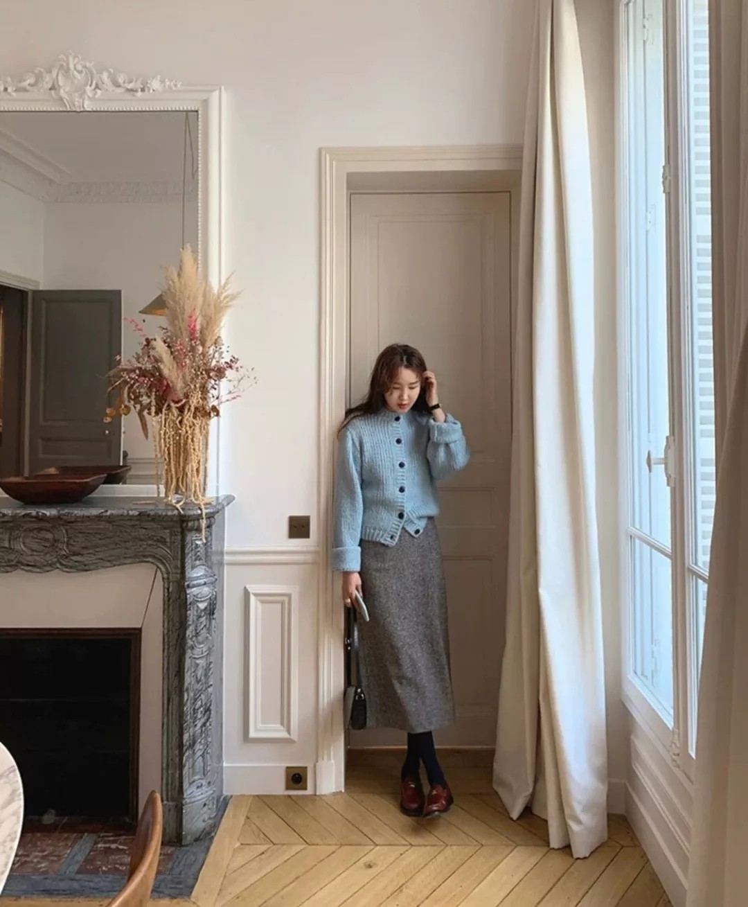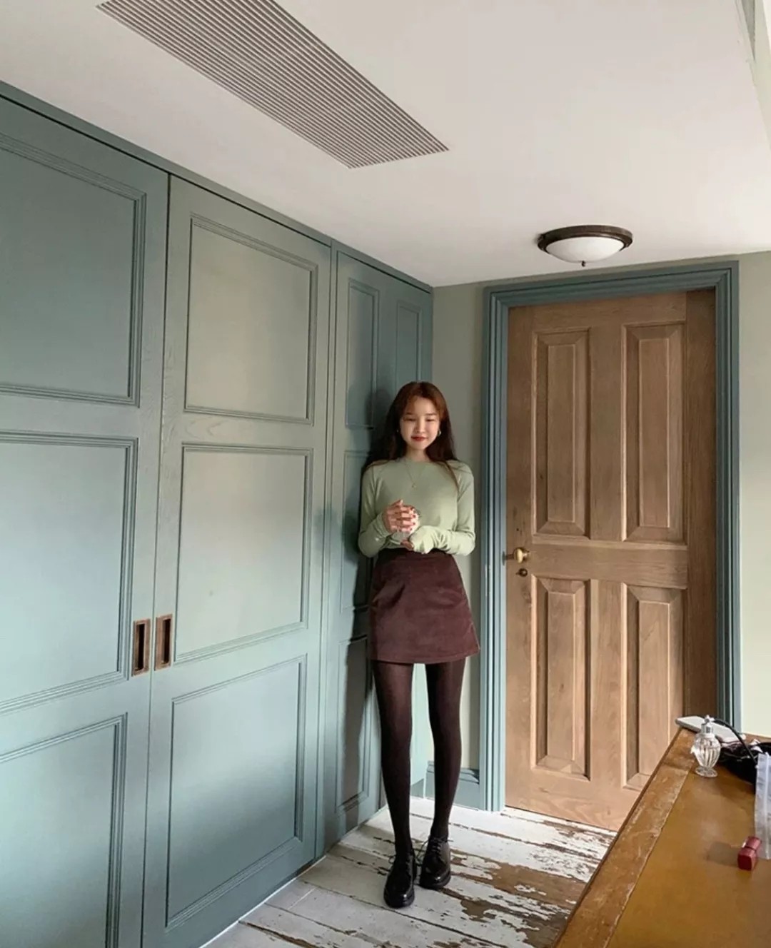 一直以极具个人风格的感性搭配受到很多人喜爱,颜色搭配也很独到,像这样雾霾绿打底衫+棕褐色短裙,就十分讨喜,冬天外面加件大衣就能轻松出街。