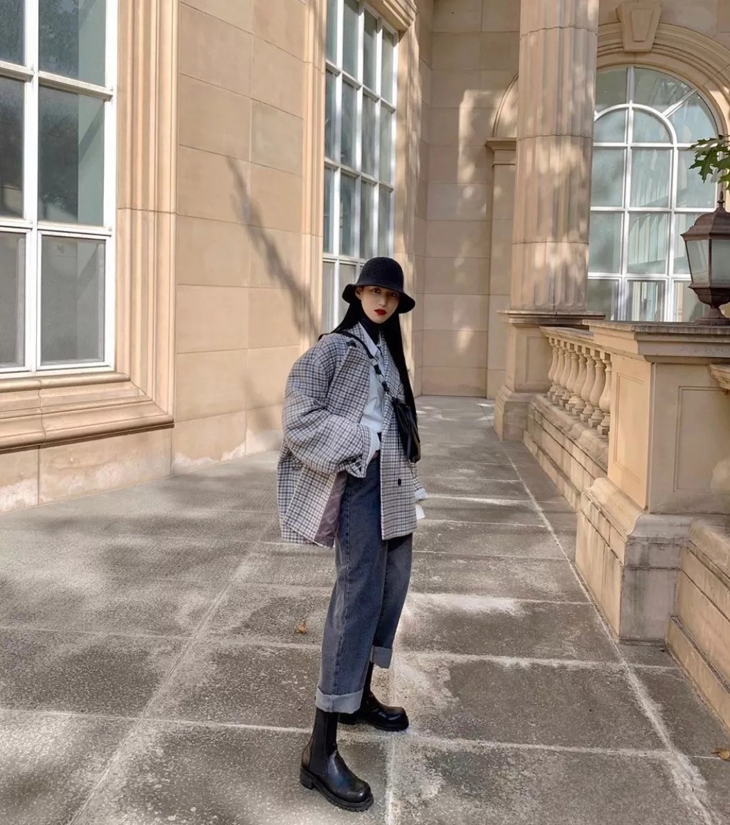 短款的格纹外套也可以驾驭得很好,大家可以借鉴一下,把衬衫叠穿在外套里,整体look很有摩登感。