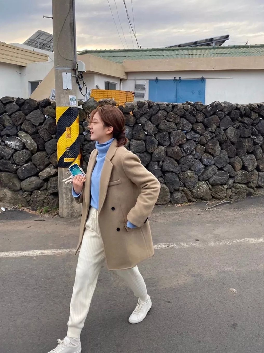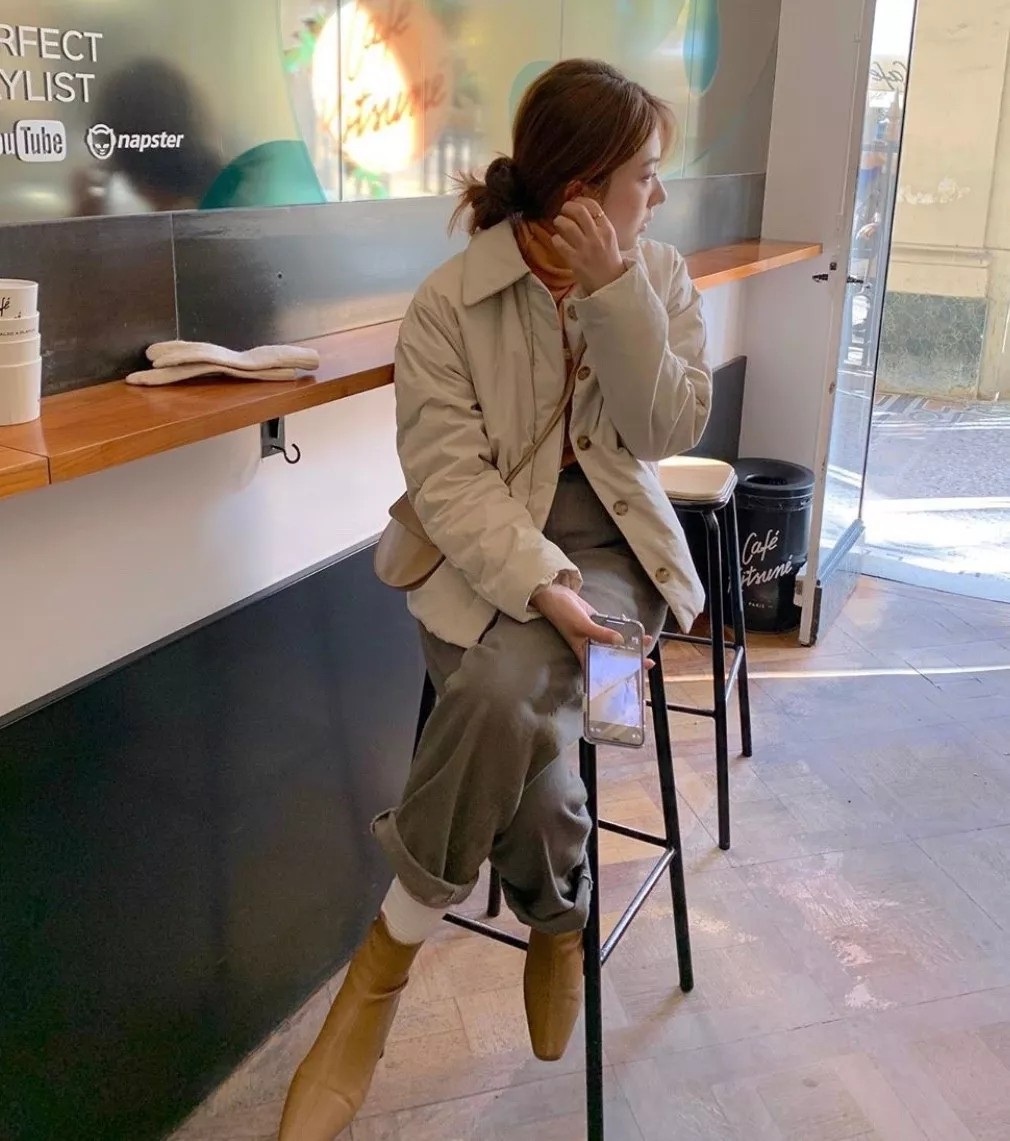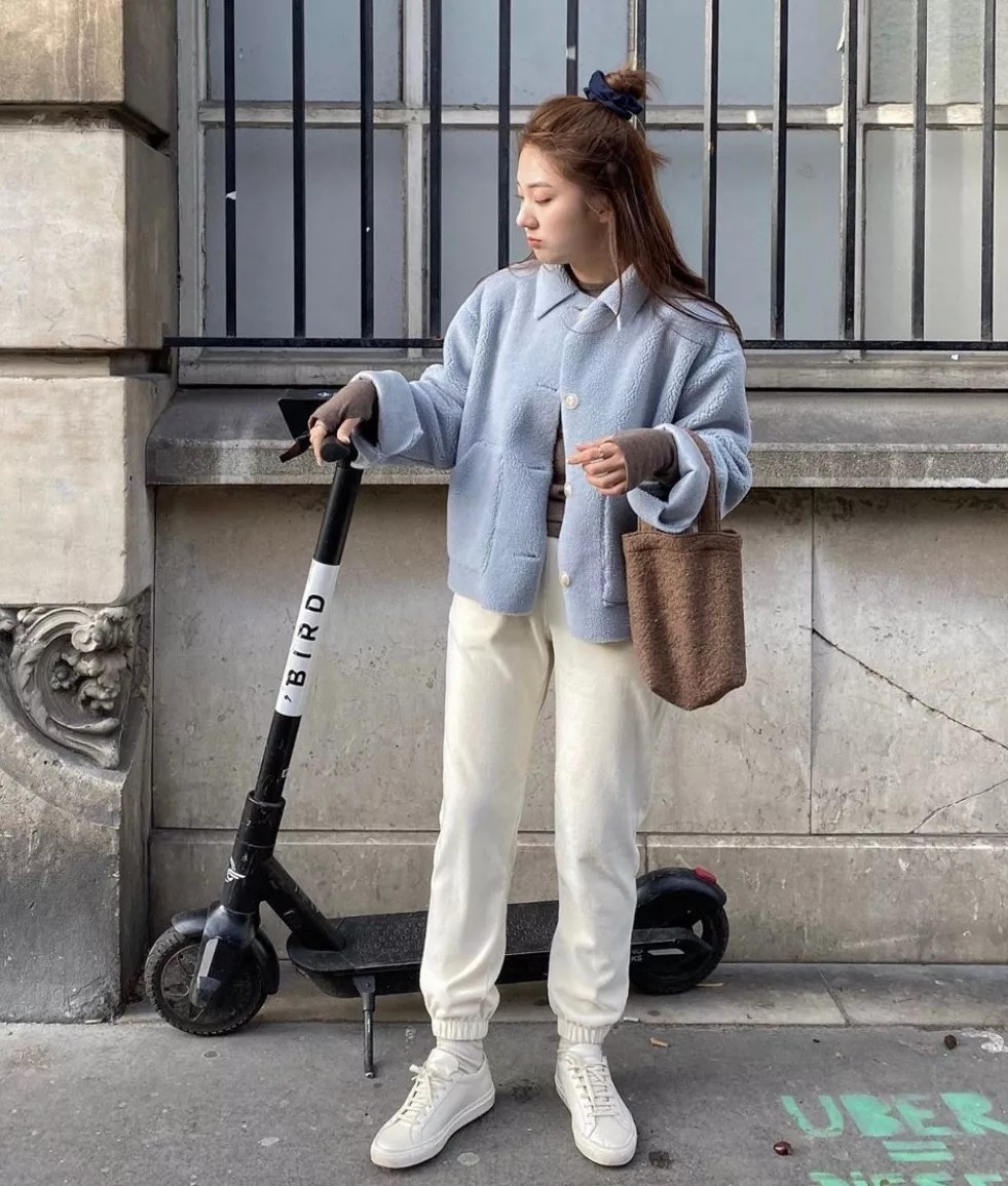 这样的穿搭适合一直走自然系女生的路线,用蓝色大衣搭配上手提包,满屏的少女氛围。 像这样短款雾霾蓝外套,下身是舒适的休闲运动裤,再绑一个半丸子头,青春又减龄,简简单单的韩系少女感。