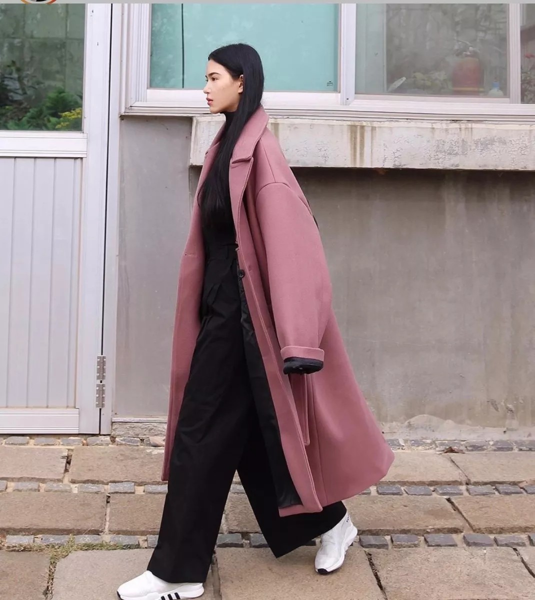 玫粉色的廓形大衣有一种气场全开的效果,里面是all black的打底,披上外套,简直走路带风。 小高领叠穿,丰富层次的同时,也增加了整体硬朗度,完全是一个cool girl。
