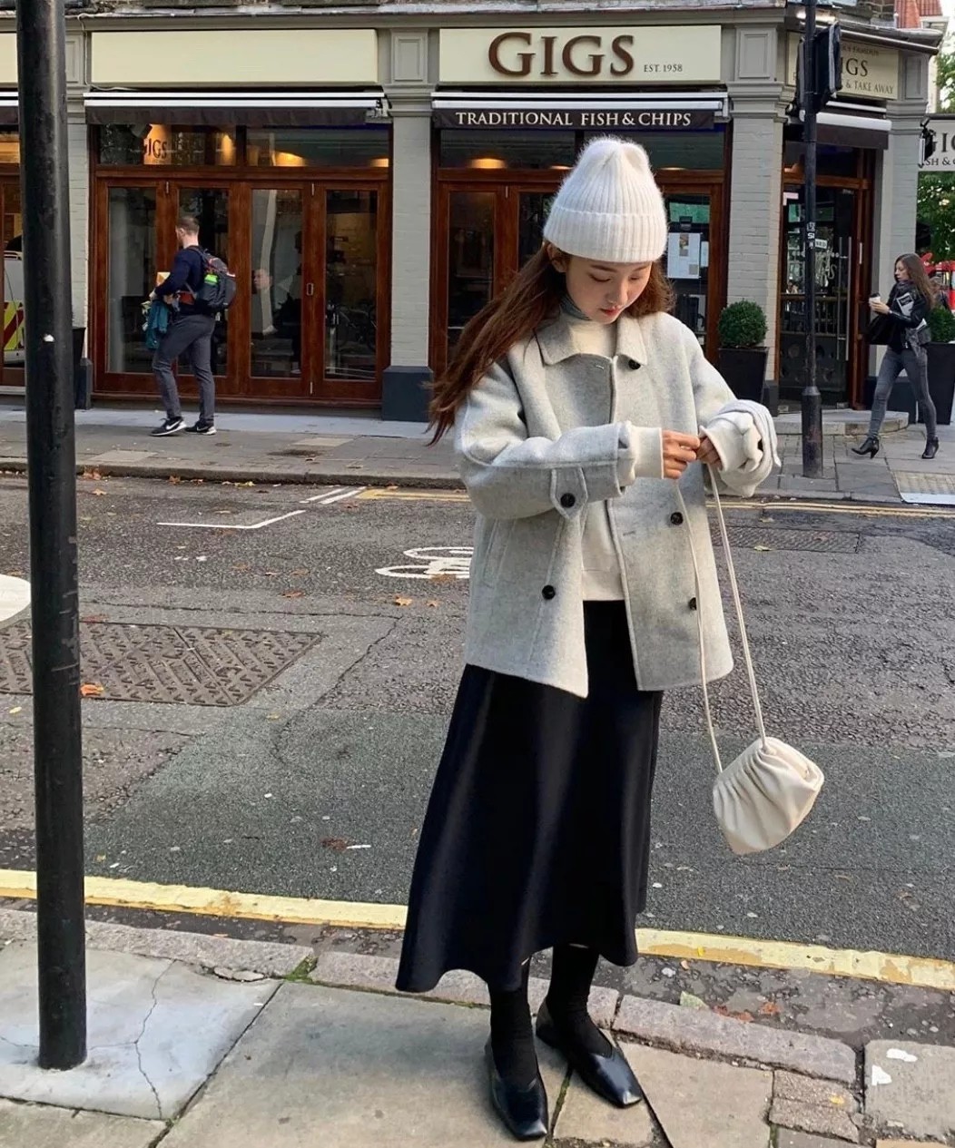 短外套+半裙的组合方式,简单的黑白灰三色,经典好驾驭,再来一顶,毛线帽加持,hin有冬日属性。