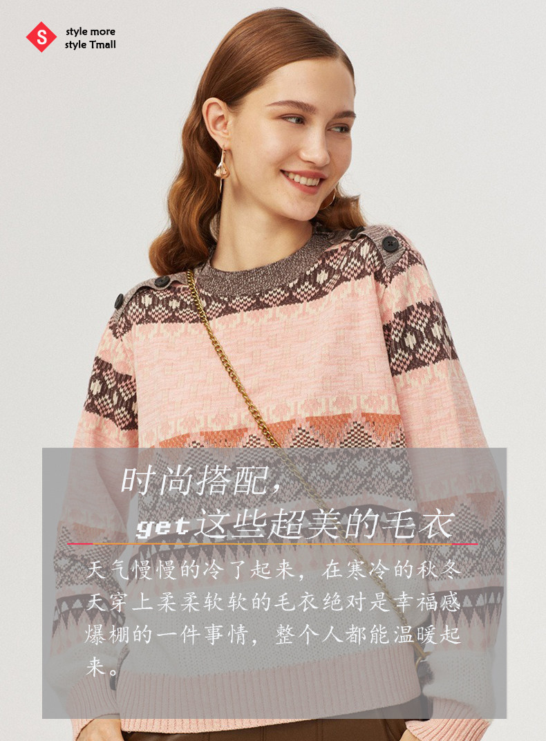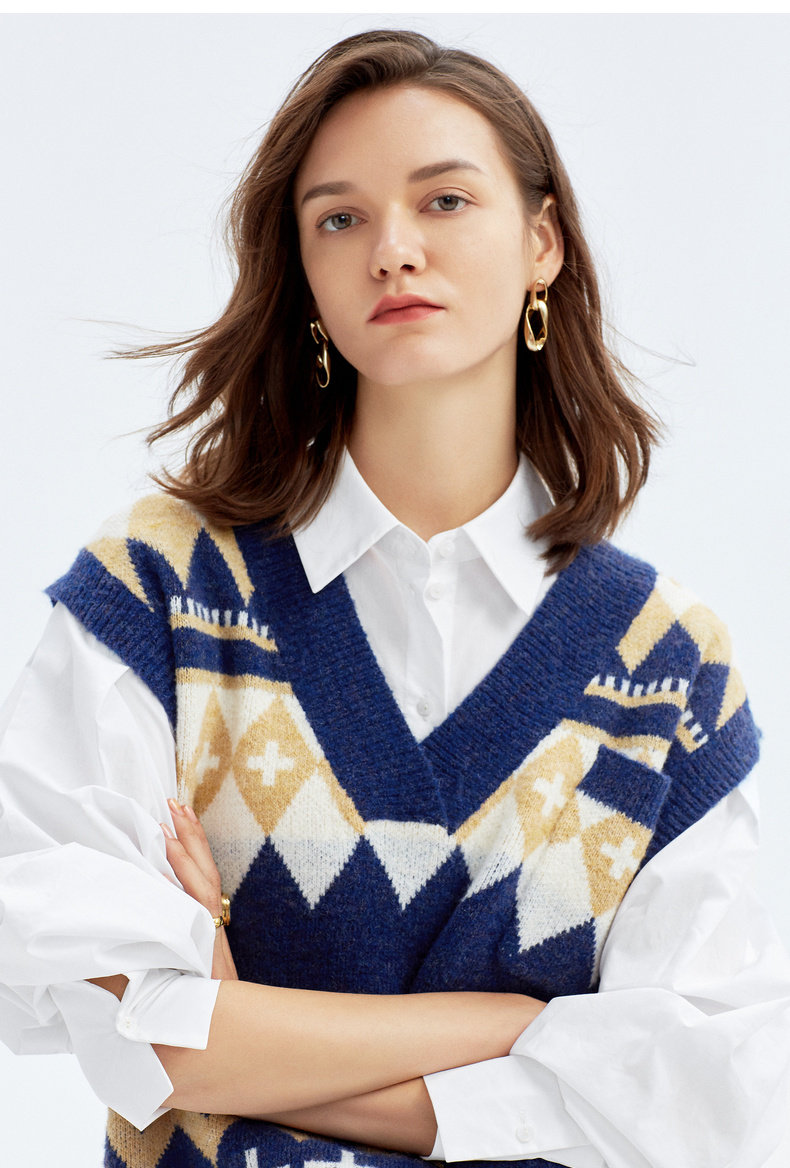 独特的费蓝岛格纹个性十足,不容易撞衫。V领的设计可以拉长颈部,显得我们更苗条。搭配白衬衫是很不错的选择。