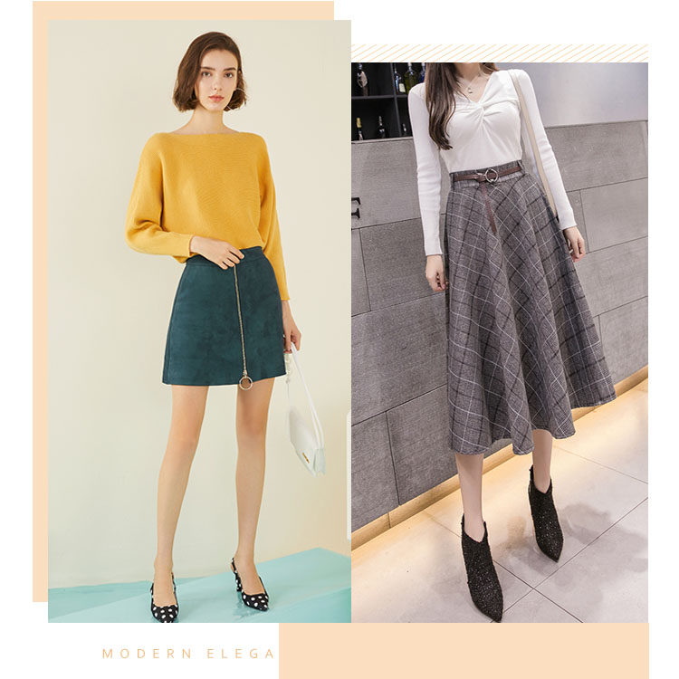 高腰A字半身裙,裙摆到小腿附近,不管是什么身材都能hold住~搭配姜黄色修身毛衣和波点高跟鞋,优雅又迷人的气质扑面而来。真是怎么搭怎么好看,非常适合通勤的小姐姐穿着。