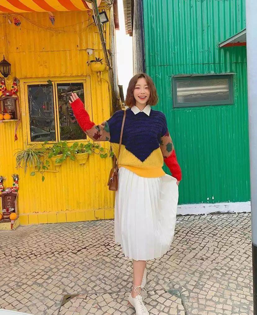 想要让上短下长更显腰身,撞色系的毛衣就得拥有姓名了。巧妙地运用不同颜色去激发整体的时髦度,增加了整体的层次感,easy chic。