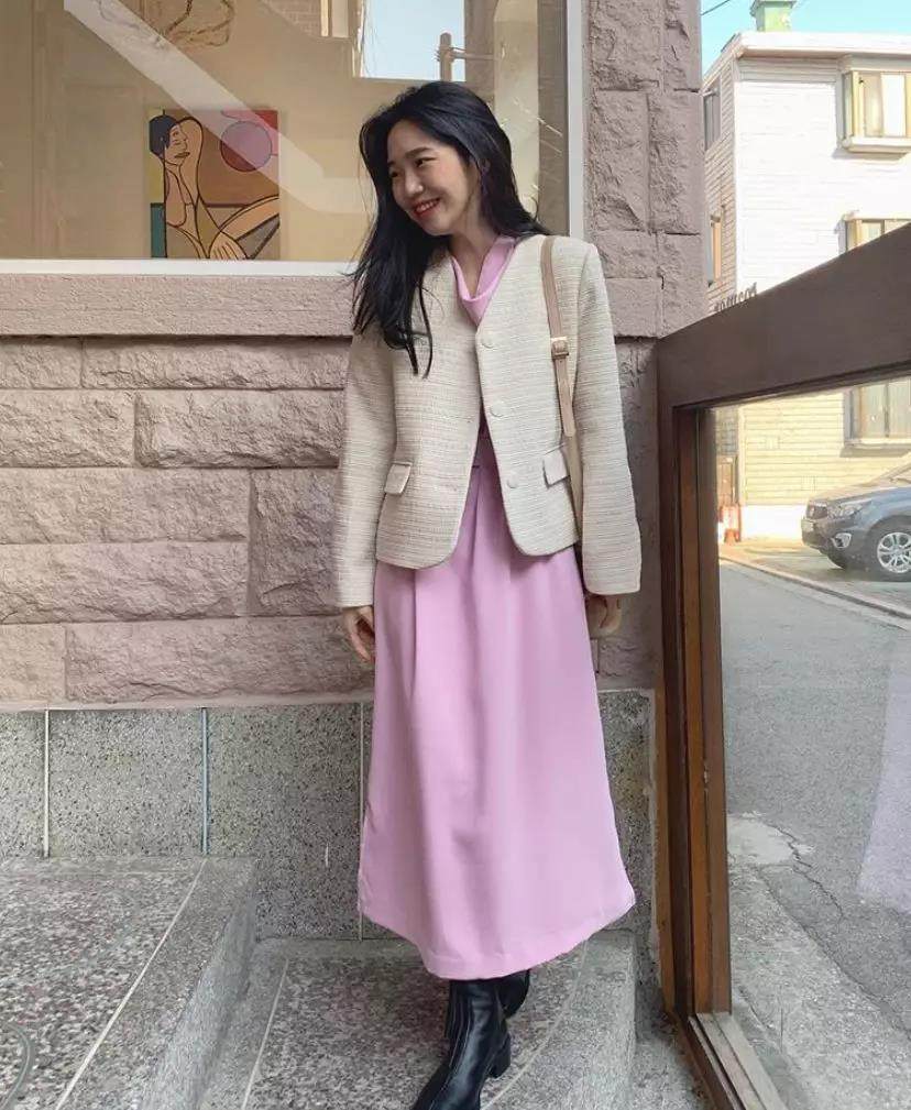 玫粉色的长裙,堪称是优雅lady的典范了。外搭一件版型挺阔的厚外套,高级感立现,就算是出席一些重要的场合,都能轻易hold住。