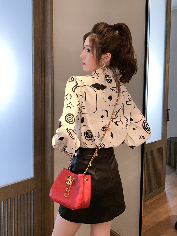 想做人群中坠出挑的那一个,来款不一般的衬衫吧!合身的版型刚好的修饰身材,显利落大方,时尚翻领加V领领口设计,拉长颈部线条修饰脸型,立体衬衫袖裁剪,上身更加挺括有型,敲洋气吸睛的印花设计,个性不落俗,回头率妥妥的,精致优雅的珍珠纽扣设计很显品质,轻熟气质衬衫,洋气时髦,爱了!