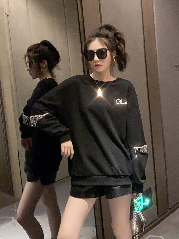 青春减龄显活力的卫衣了解一下,很多小姐姐大爱的单品呢~宽松廓形让休闲度加持,上身之后遮肉满分真的不挑人呢。衣服胸前字母装饰,时尚显个性,简约款式也能很酷。衣袖水钻流苏设计,个性吸睛,炫酷炸了。恰好的长度设计,搭上一条时尚短裤,分分钟穿出下半身失踪感,高挑显腿长,大幂幂附身啦!