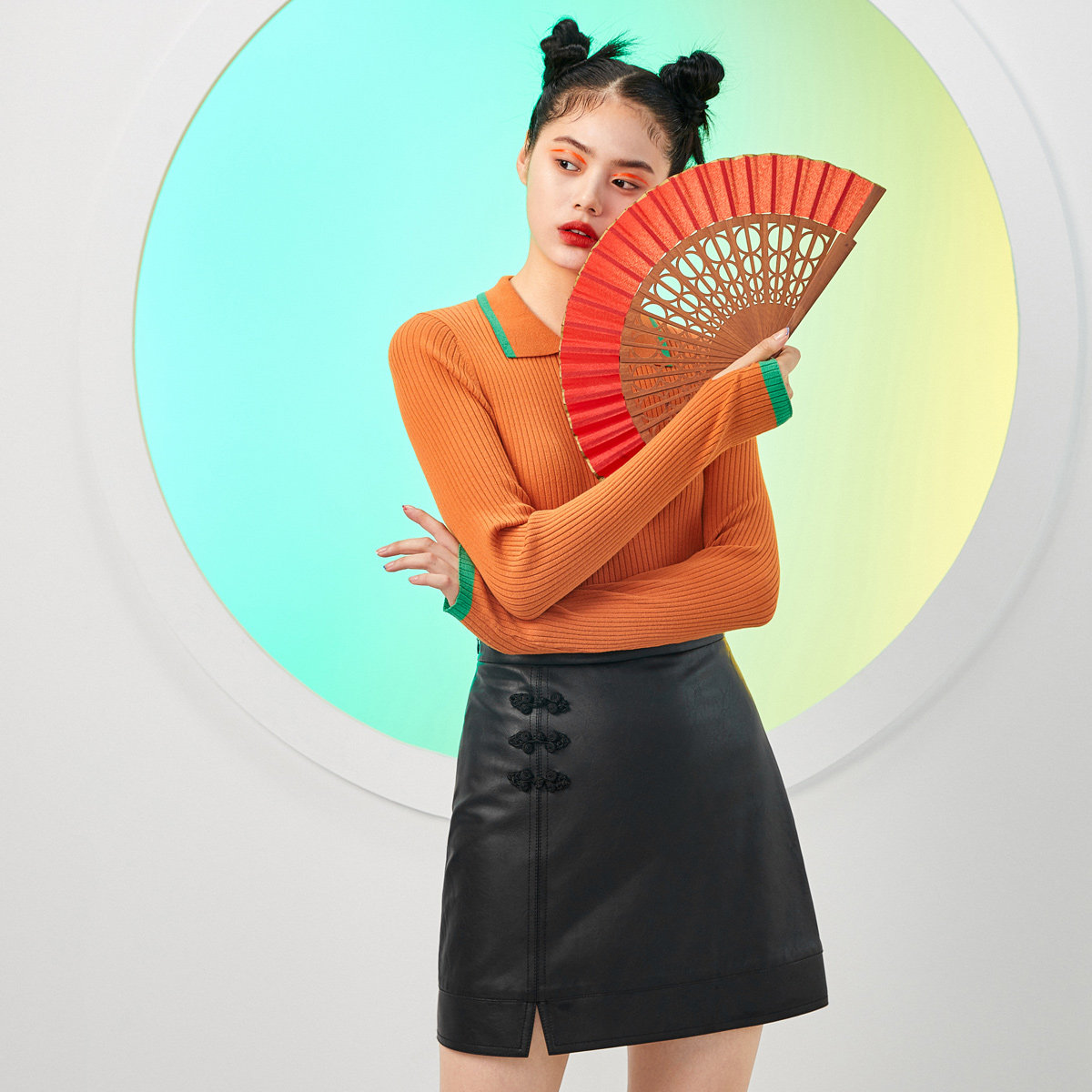 A字短裙通常带有俏皮活泼的味道,穿上就是打造大长腿的帮手,和老爹鞋搭配一起完全没有违和感,还能突出裸露腿部修长。上衣无论搭配夹克或者毛衣均可盐可甜,配上一双颜色鲜艳的中筒袜,增添视觉层次感,营造出独特的时尚品味。