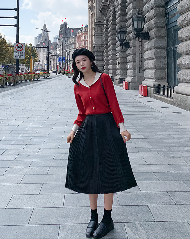 套装也有它的时尚新主张,挺括的裙身修饰腿部线条展现出廋美腰线。短款的红色毛衣与黑色半身裙经典的黑与红色,碰撞出十足的复古感,穿上气质感爆棚哦~~