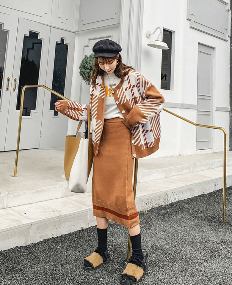 时尚女装针织,百搭易穿。温柔奶茶色的针织毛衣和深色毛呢半身裙,尽显女人的优雅柔美气质。可爱的卡通印花图案打破了原有的单调平庸,让人显得更加温柔娇媚