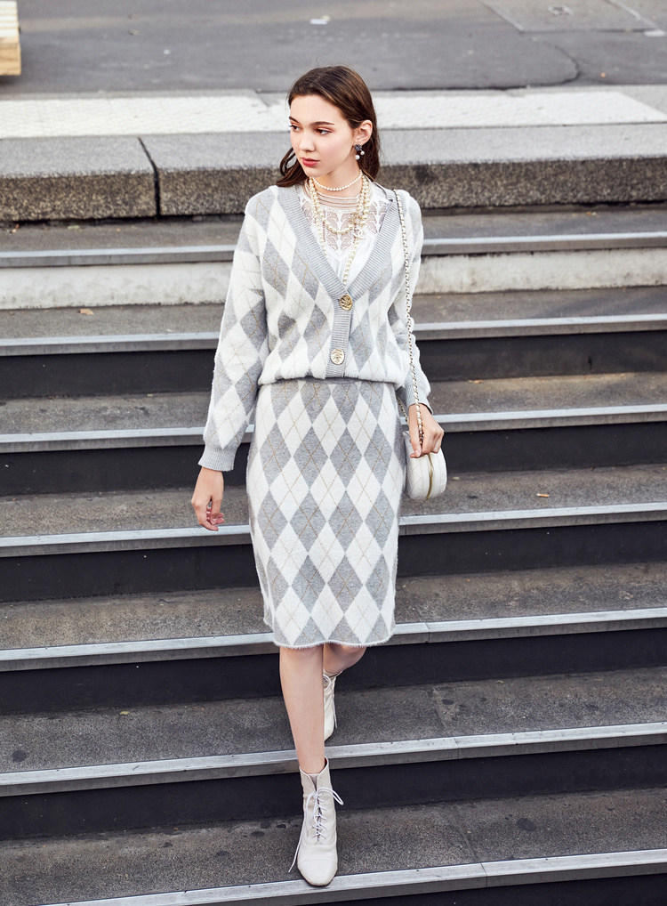 这款小香风的的针织套装,保暖又兼具时尚品味。菱格纹的图案在视觉上十分显瘦,第一眼就让人沉醉其中,女人味十足哦~~