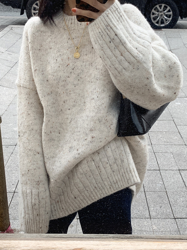 这oversize宽松版型,很符合今年的潮流趋势,基础款的针织衫这个秋冬是一件好搭配的单品,选用柔软优质的材质打造。手感细腻滑糯,温暖又舒适,总是能为你打造出优雅有魅力的造型。这材质中还夹杂一些颜色,让整体看起来不会过去单调。