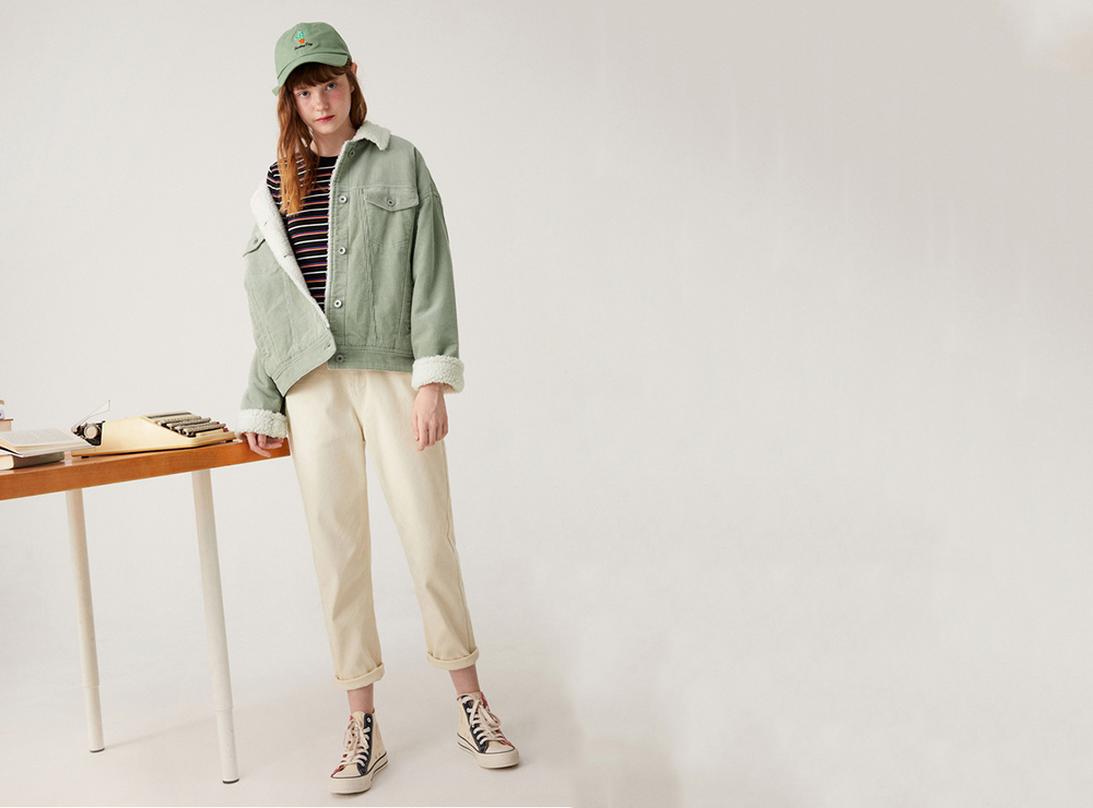 森马这款夹克最显眼的就是字母标语,立体饱满,表达着年轻人的自我态度。在材质上利用了灯芯绒作为“表皮”,显得复古怀旧不说,还更有秋冬的氛围,搭配内里的柔软羊羔毛,穿着十分舒适,时刻保持了温暖属性。