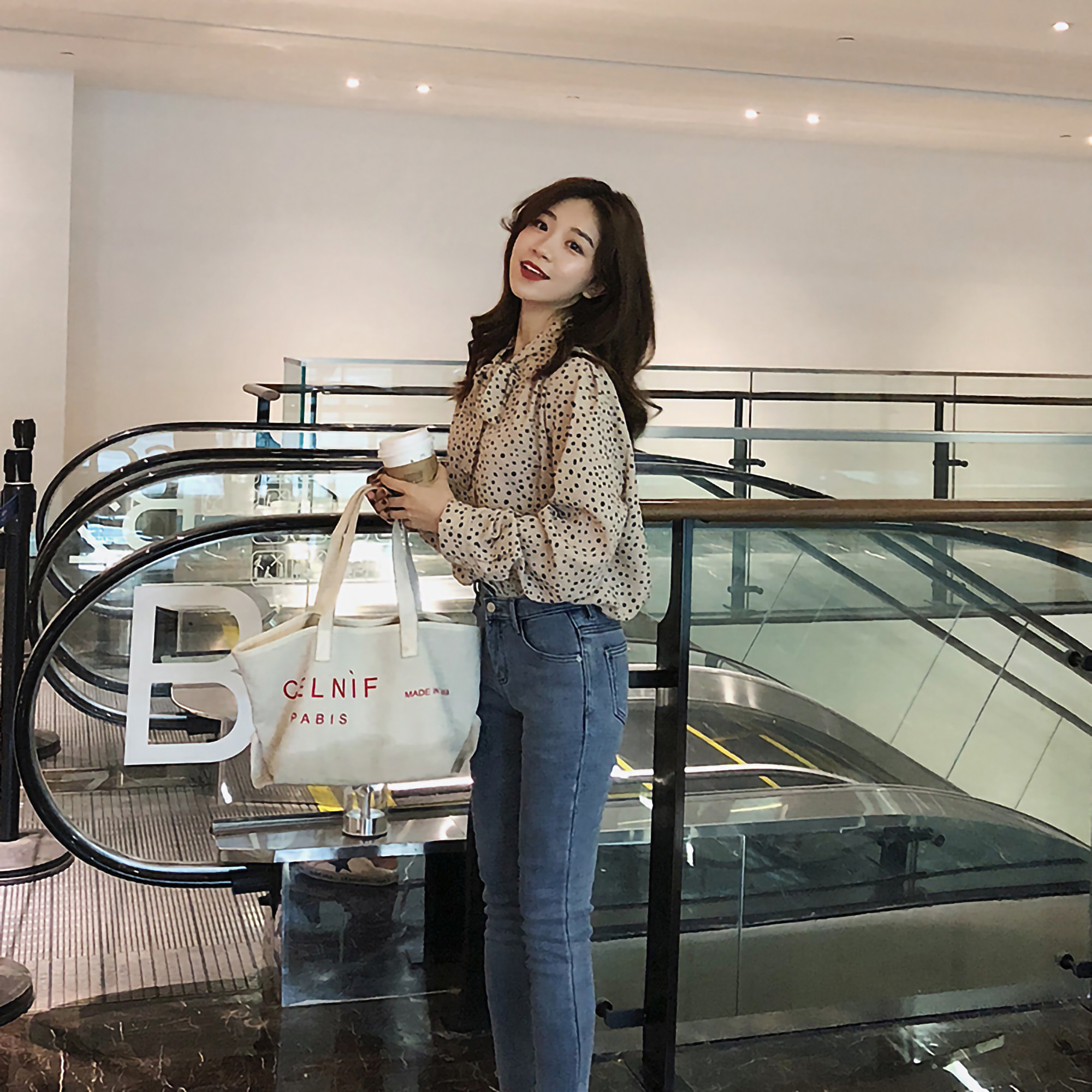 波点小衫简洁精神的款式,无需太多点缀,只需搭配一件基础款牛仔裤,就是稳稳的文艺范儿,让你周身有种浓烈的冷都女范儿,气场全开。