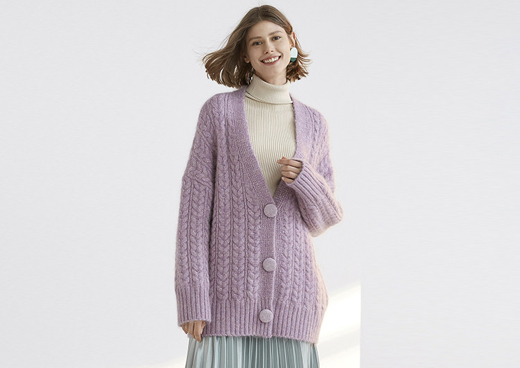 选用细腻的马海毛面料制作,保暖亲肤很有质感。宽松的落肩款式,采用V领开衫设计,穿出慵懒休闲感又很显瘦,两侧直插口袋做工细致,美观实用,版型十分耐看。