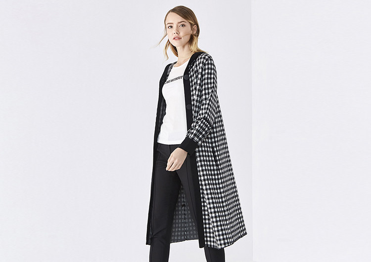 中长款宽松的版型自带气场,修身效果也非常好。采用翻领门襟设计,简洁利落很显气质。经典的格纹元素,带来浓郁英伦风尚,两边撞色拼接的口袋,新潮显眼又有实用性。