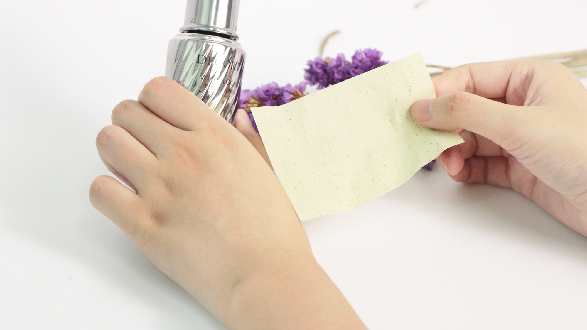 很多精华涂了之后皮肤还会粘粘的,或者是出现假滑之类的问题,为了证明这款精华有多清爽、多快吸收,涂抹之后就用吸油面纸轻轻按压,面纸上干干净净,一点油光都没有,足以证明它肤感有多优秀~
