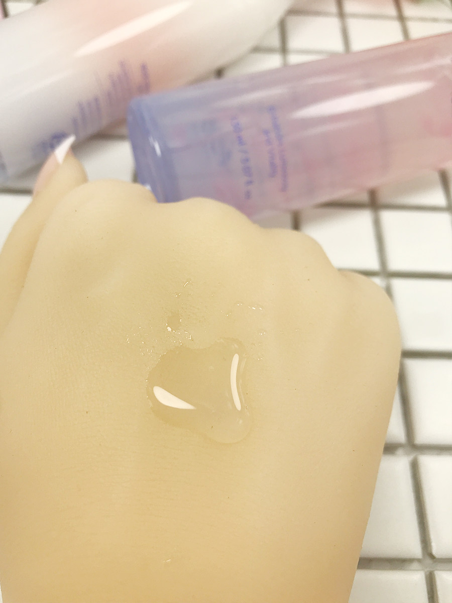 JAYJUN密集焕亮水乳套装,水的质地很轻薄,是透明的水状质地,带着樱花的花瓣,深层润泽肌肤;乳液是乳白色的霜状质地,涂抹后能快速的被吸收,温和不伤肤,不会粘腻。