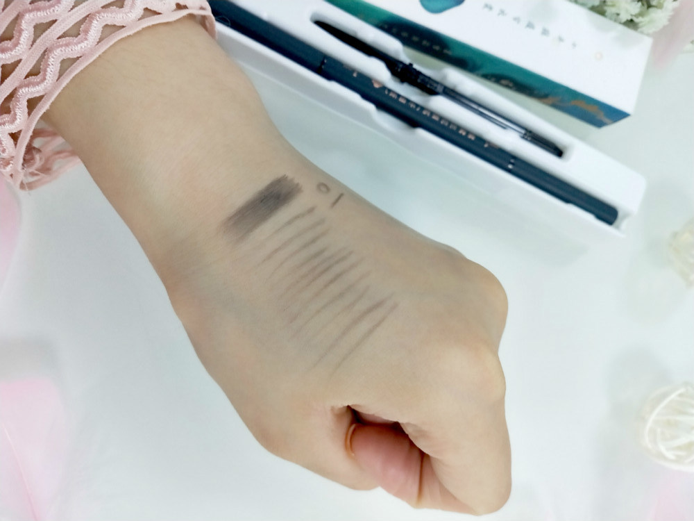 在炎热的夏天, 眉笔的防水防汗功能也非常重要。不然经历大量流汗或者突如其来的暴雨天,眉毛分分钟跟你“玩消失”。我将眉笔画在手背上,用水冲刷测试,发现抗水能力极强,完美没有晕染掉色现象。但是真实上妆之后,肌肤出油会溶解掉一部分眉毛,如果搭配蜜粉定妆,才能拥有更持久的妆效。