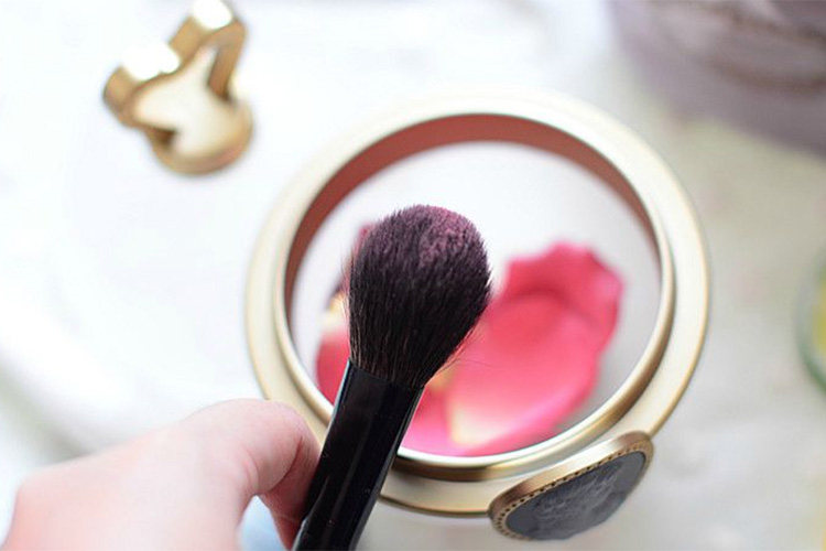 因为是花瓣的造型,不好取粉。对刷子的要求及高,必须用特别柔软细腻的灰鼠毛刷才行。(羊毛刷都不好用!)首先使用腮红刷在腮红蛊里,轻轻扫几下花瓣,沾取腮红粉,沾取过程中注意手法要轻,避免下手过重。沾上腮红粉后,轻轻弹一下腮红刷,震去多余的粉,便于上色均匀。从太阳穴正下方开始到脸颊中心,用打圈的方式刷腮红,连续画三四个圈即可。