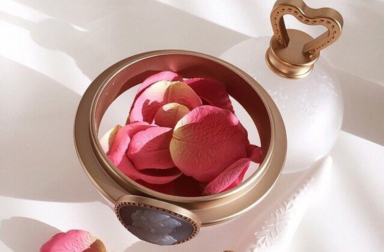 这款腮红如同珠宝盒般,放在梳妆台上就是最美的装饰品。腮红被装载在一个蛋形的壳子里,融入少女人像点缀,为造型增添几分华丽格调。打开盖子,可以看到里面铺满了片片的玫瑰花瓣。这些都是纯手工制作的,花瓣的造型精致,不易碎,无论是纹路和卷曲度都宛如新鲜的玫瑰。细细闻,还能闻到淡淡的玫瑰香,令人一秒穿越到中世纪复古的宫廷场合。当你用完腮红后,也能将它当作收纳盒,放一些自己的饰物或是心爱小品。