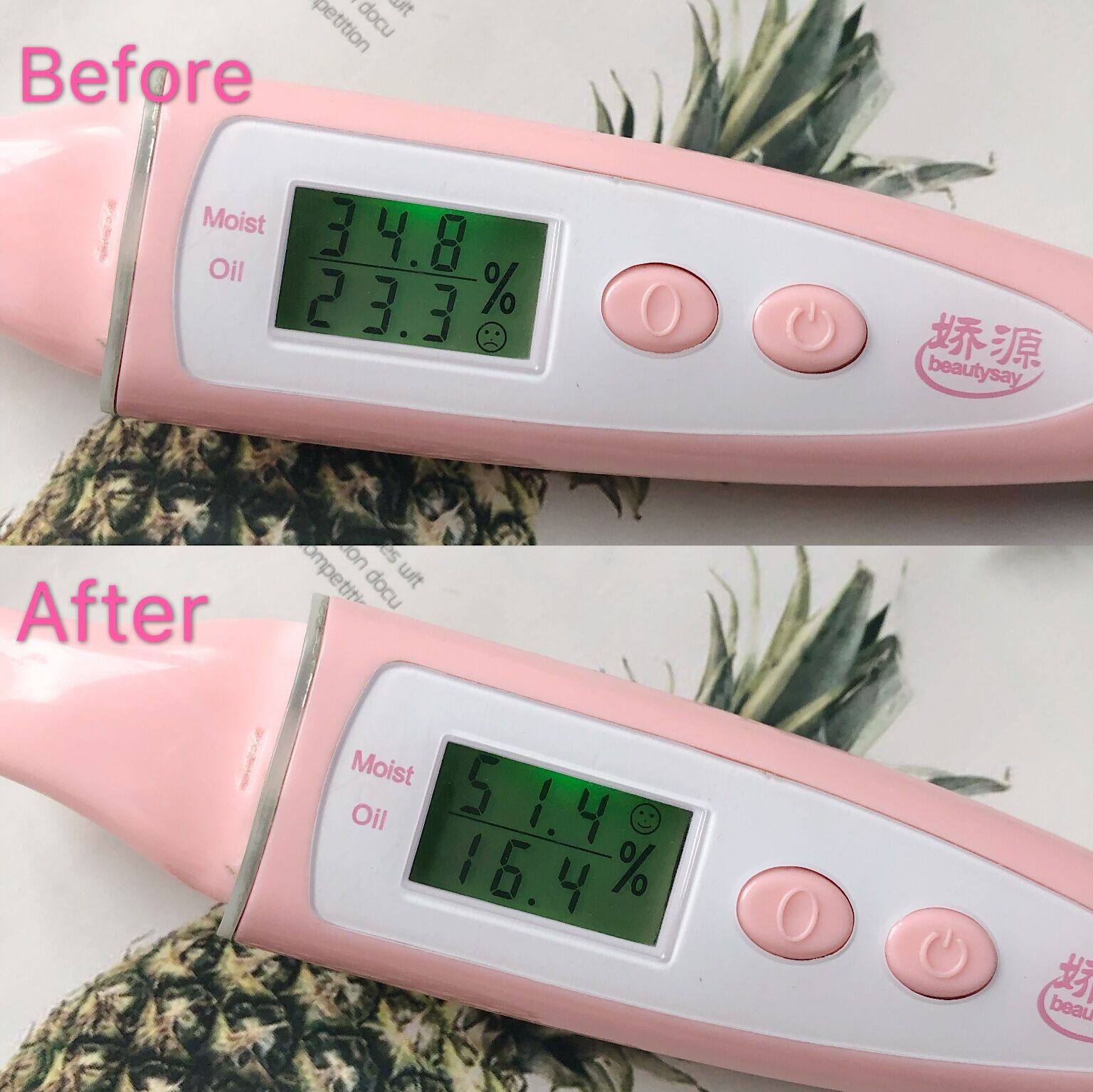用水分测试仪测试了一下,可以看到补水效果真的超赞,使用后肌肤含水量提高了将近20%!