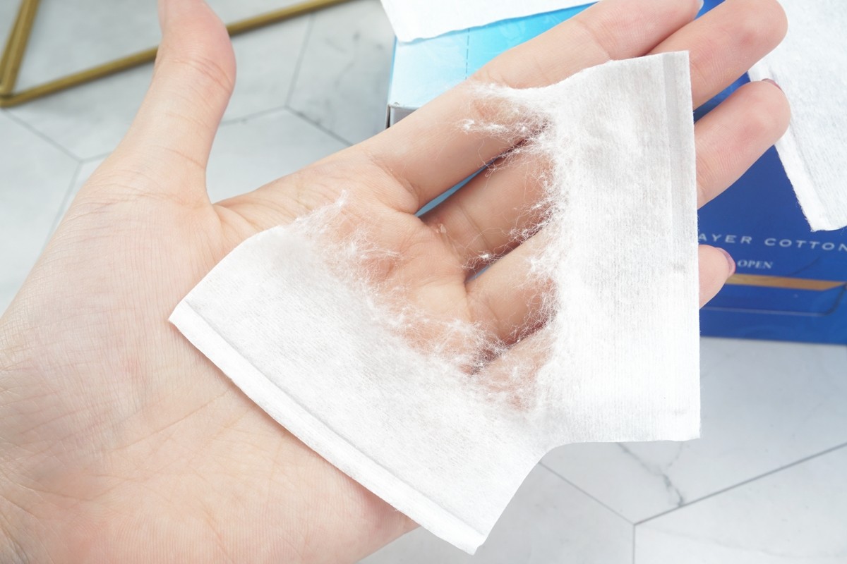我有买过其他牌子的多层化妆棉,不少会出现片与片之间难分离、连接处掉絮等问题,但白元这个做工非常好,轻轻松松就能将五片分开,每一片的边缘都是干净利落的,表面光滑不起毛,摸起来十分柔软,而且将它撕开两半也不会有棉絮掉落,纤维紧密,就算是卸妆来回擦拭肌肤也不怕一脸屑屑了。