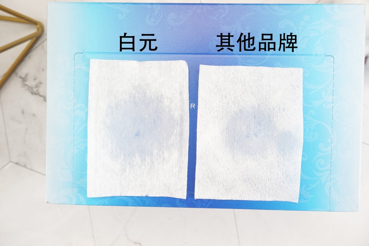 市面上有很多化妆棉都是采用脱脂棉的,吸水力比较强,也就费水一些,但白元化妆棉选用未脱脂漂白棉,提高化妆水的延展性,更省水。用另外一款薄款的化妆棉和白元对比,往化妆棉倒上相同量的爽肤水,白元款明显扩散的面积更大更均匀。